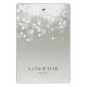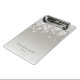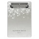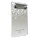 Chic clipboard features two lines of custom text in classic black lettering on a silvery grey background adorned with a burst of white bokeh lights at the top. Design repeats on reverse side. Please note that this clipboard is a mini size; full size version also available in our Platinum Glow collection.