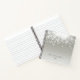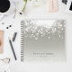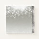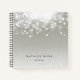 Chic notebook features a silvery grey background adorned with a burst of white bokeh lights at the top. Personalise with two lines of custom text along the bottom in classic black lettering.