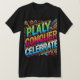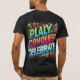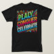 The t-shirt design features the phrase "Play, Conquer, Celebrate" in a vibrant, playful font. The colours are bright and energetic, reflecting a sense of excitement and achievement. The overall design is dynamic and eye-catching, making it perfect for anyone who embraces a spirit of competition and celebration.