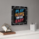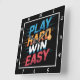This black wall clock features the text "PLAY HARD WIN EASY" stacked in bold, slightly distressed letters with colour gradients: blue for "PLAY," orange for "HARD," white for "WIN," and red for "EASY." A stylised basketball is incorporated into the word "HARD." Horizontal speed lines accent the text, conveying energy and motion. The design is sports-themed and motivational.