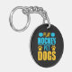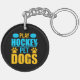 Hockey player keychain great for male and female hockey players, features hockey pucks, a hockey stick, dog paw prints, and text reads Play Hockey Pet Dogs!