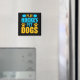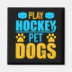 Hockey player magnet great for male and female hockey players, features hockey pucks, a hockey stick, dog paw prints, and text reads Play Hockey Pet Dogs!