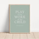 A poster featuring the quote by Maria Montessori, "Play is the Work of the Child", in shades of green.