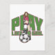 Female soccer player in pink shirt stand tall with foot on soccer ball. Play Like a Girl text for the tough and ready girl soccer players!