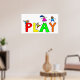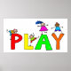 Cute cartoon illustration of little boys and girls climbing over giant letters of the alphabet that spell out the word PLAY. Image available on various gifts and products. Posters. Prints.