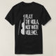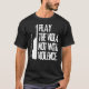 This minimalist graphic features the bold message "PLAY THE VIOLA, NOT WITH VIOLENCE." The text, in white distressed font, has a raw, rock-inspired vibe. A half viola and bow symbolically link music with peace. The black and white colour scheme enhances the powerful message.