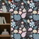 Infuse your home with warmth and character with our enchanting peel-and-stick wallpaper! The graphic style is a delightful blend of modern whimsy and classic elegance. Against a deep charcoal background, stylised flowers bloom in shades of pink, blue, teal, and cream. Leaves exhibit intricate patterns—some with polka dots, others with fine line work. These add texture and depth to the overall design. Remember, this peel-and-stick wallpaper is more than decor—it’s an expression of your unique style!