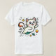 This illustration showcases a whimsical cartoon-style cat, with a white body, black stripes, pink cheeks, and a lively curved tail with an orange tip. Surrounded by vibrant elements like yellow stars, a green ball, and an orange ball, the design pops against a solid black background, creating a fun and energetic vibe.