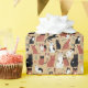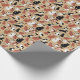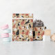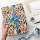 Wrapping paper in a variety of cute, stylised cats in various playful poses, colours, and patterns - tabby, black, white, and calico - set against a tan background. Scattered foliage and tiny hearts add playful accents to the design.