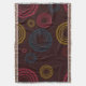 Cool, unique, trendy, urban abstract seamless illustration pattern art of colourful circles made with short, inclined lines. Modern and vibrant graphic design artwork. Pink, yellow and blue colours on dark red.
