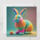 A soft, playful, cuddly knitted bunny in pastel colors with tiny yarn eggs, perfect for Easter greeting cards and spring holiday decor. The design is charming and plush, with a handmade feel and bright, warm, friendly appeal.