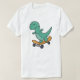 Whimsical dinosaur riding a skateboard, vibrant colours and fun style ideal for youth and casual wear, blending adventure with playful originality.