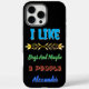 A hand holds a unique case decorated with a whimsical quote expressing love for dogs and a fondness for just three people, specifically mentioning the name Alexander.