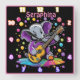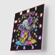 A whimsical elephant with vibrant purple skin strums a bright yellow guitar, surrounded by colourful bubbles and a joyful rainbow backdrop, creating a lively atmosphere of celebration.