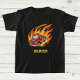 This cheerful personalised kids' t-shirt features a bold, cartoon-style red fire truck surrounded by stylised flames that curve and flicker. The flames are vibrant shades of orange, red, and yellow, giving a sense of motion and energy.