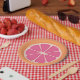 Bright colours and simple designs help to create a cute and playful pink grapefruit slice cross section. This vivid image adds a cheerful touch to any meal or party on these plates.