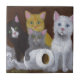 An acrylic painting of four kittens in the moment they are busted while having a wild time with a roll of toilet paper is featured on this fun, decorative tile!