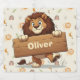 This fun personalised kids' bottle label features a playful cartoon lion holding an oversized wooden name sign.