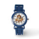 This fun personalized kids' watch features a cute cartoon lion holding an oversized wooden name sign.