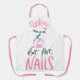The "Playful Manicure Stylist Apron" is designed for beauty professionals with a lighthearted and stylish approach to their craft. This apron features a fun and whimsical design with the phrases "Cookies can wait, But first, NAILS" in vibrant pink script, accompanied by charming illustrations of a nail polish bottle and a manicure jar. The white background contrasts beautifully with the pink accents, making it visually appealing and perfect for salons that want to add a touch of personality to their environment.