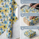 This playful floral pattern features large, cheerful blooms in soft blues and yellows, accented with bold black outlines and dotted centres. Set against a clean white background, the design captures a fun, retro aesthetic perfect for adding a lively touch to home decor, textiles, or accessories. The bold outlines and soft colours combine to create a charming, nostalgic feel, making this pattern ideal for those who love vintage-inspired designs with a modern twist.