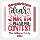 A whimsical Christmas sticker features the phrase Dear Santa, I plead no contest in bold, festive lettering. Candy canes add a delightful touch. Perfect for holiday decor or gift wrapping, it captures the spirit of playful holiday wishes.
