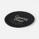 Congrats Grad! Playful white script with golden graduation cap accent, graduation party paper plates. Features, black color background.