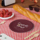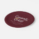Congrats Grad! Playful white script with golden graduation cap accent, graduation party paper plates. Features, burgundy red colour background.