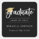 Playful white script with golden graduation cap accent, stickers. Features, black colour background. Template text lines for graduation year, graduate's name and school.