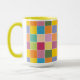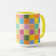 Colourful chequered coffee mug designed with various shades of yellows, orange, greens, lavender and blue.