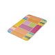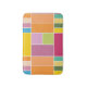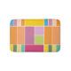 Colourful geometric blocks bath mat designed with various shades of yellows, orange, greens, lavender and blue.
