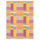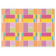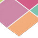 Colourful geometric blocks tablecloth designed with various shades of yellows, orange, greens, lavender and blue.