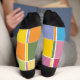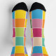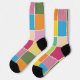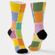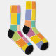 Colourful chequered pair of socks designed with various shades of yellows, orange, greens, lavender and blue.