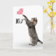Grey tabby cat with pink heart balloon for 103rd birthday on white background.