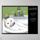Add a splash of humor to your day with this playful illustration featuring a relaxed white cat lounging in a bathroom sink beside a tempting faucet and soap dish. Paired with a witty phrase about love and self-control, this charming and lighthearted design is perfect for cat lovers, pet owners, and anyone who appreciates funny cat art.