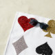 This custom beach towel features a poker or casino playing cards theme with the symbols for the various suits. The hearts are printed in red, the clubs in gold, the spades in black, and the diamonds in silver. The images are printed in a tiled pattern across the rug. A sample name is printed at the bottom. You can personalise the towel to include your own custom name or other text.