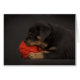 rottweiler 1,5 months old puppy is playing with red yarn ball