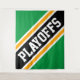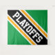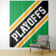 This sporty design features athletic PLAYOFFS text inside a highlighted wide diagonal black, white, and golden yellow orange racing stripes against wide bright green outer stripes. The text in this design can be personalised.