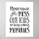 'Please excuse the mess, our kids are busy making memories' black and white kids print poster features modern hand written typography in black and white. Great for a kids bedroom or play room and suits a monochrome decorating style.