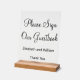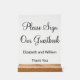 Please sign our guestbook is an elegant black script. The other text is not in a script. The other text is for the names of the bride and groom and a custom message such as Thank You. All text can be edited or deleted.