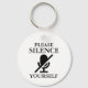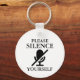 Round button keychain features a microphone on mute and the text "Please Silence Yourself" Keychains make fun gifts for family and friends or create for yourself.