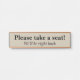 This basic design features the message "Please take a seat!", along with the message "We’ll be right back". This could be used in a waiting lounge or a reception area to inform customers, clients or patients that they will be greeted shortly, and that they should have a seat until then.