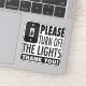 Please turn off the lights, thank you sticker in black and white typographic design to remind people to turn off lights and save energy in your home, business, or community gathering place.