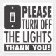Please turn off the lights, thank you sticker in black and white typographic design to remind people to turn off lights and save energy in your home, business, or community gathering place.