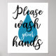 A typographic hand washing poster with a large blue water drip, perfect for bathrooms at home or at work, nicer to llok at than safety signs, please check my shop for other designs in this series.