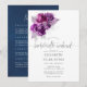 Dark plum purple roses and silver glitter tropical foliage bachelorette weekend invitations with itinerary and a navy blue watercolor wash reverse.