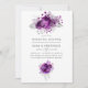 Dark plum purple roses and silver glitter tropical foliage wedding shower invitations with a navy blue watercolor wash reverse.
