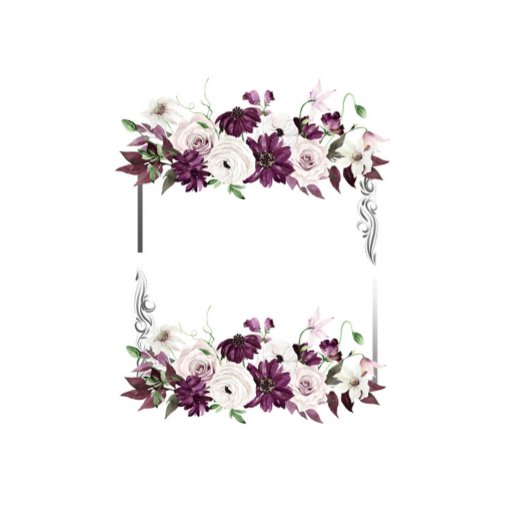 Design features a printed coloured with floral element in shades purple, violet, lilac and white over foliage leaves roses and peony on a purple watercolor background.. Great for your wedding celebrations!