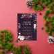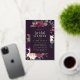 Chic floral bridal shower invitation features a border of burgundy marsala purple, blush pink, and dusty blue flowers, with lush botanical foliage and greenery and gold foil trim. Personalise with your bridal shower details in modern lettering on a rich dark purple background.