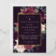 Chic floral confirmation invitation features a border of burgundy marsala purple, blush pink, and dusty blue flowers, with lush botanical foliage and greenery and gold foil trim. Personalise with your church ceremony and celebration details in modern lettering on a rich purple background.